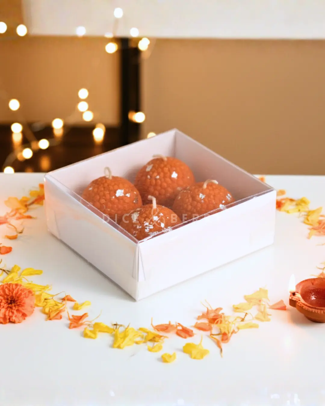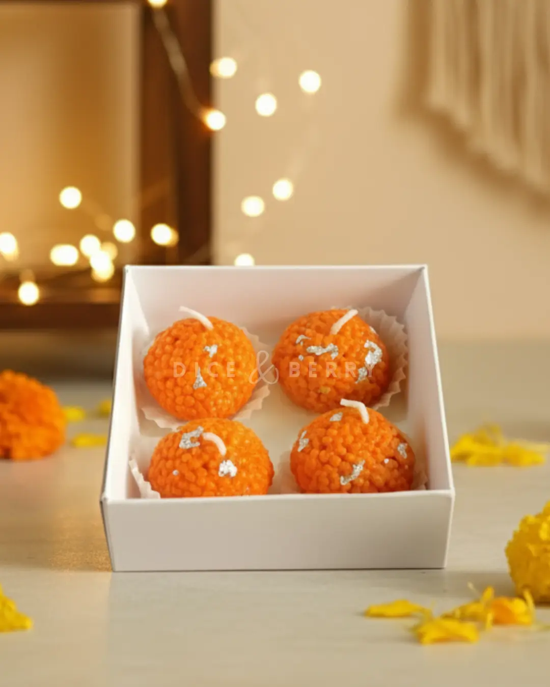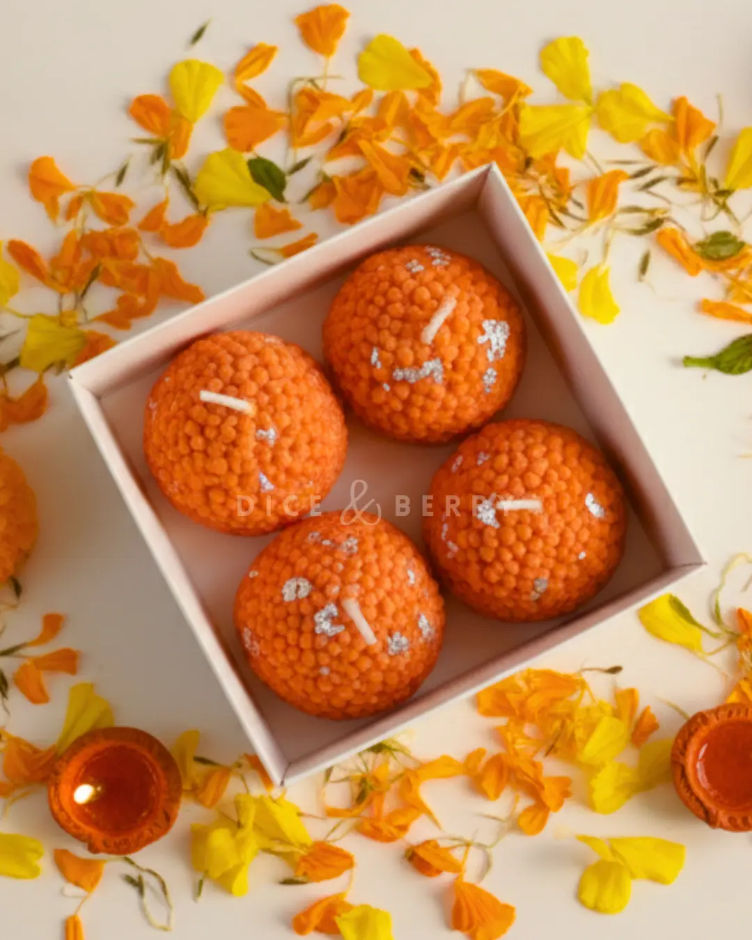 Celebrate sweet moments with our Laddoo Mithai Scented Candle Set (Pack of 4). Handmade with pure soy wax, these cute dessert-inspired candles look just like real Indian sweets and bring a warm, festive vibe to any space. Perfect for Diwali décor, celebrations, birthdays, weddings, or gifting to anyone who loves unique, fun, food-themed candles. A delightful, affordable set that instantly adds charm and sweetness to your home.